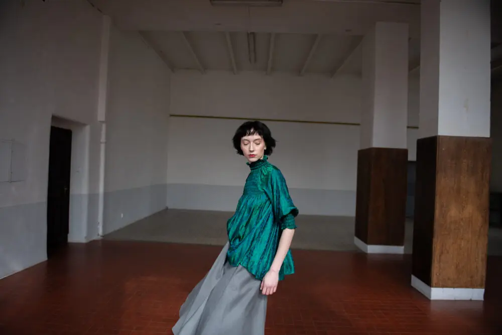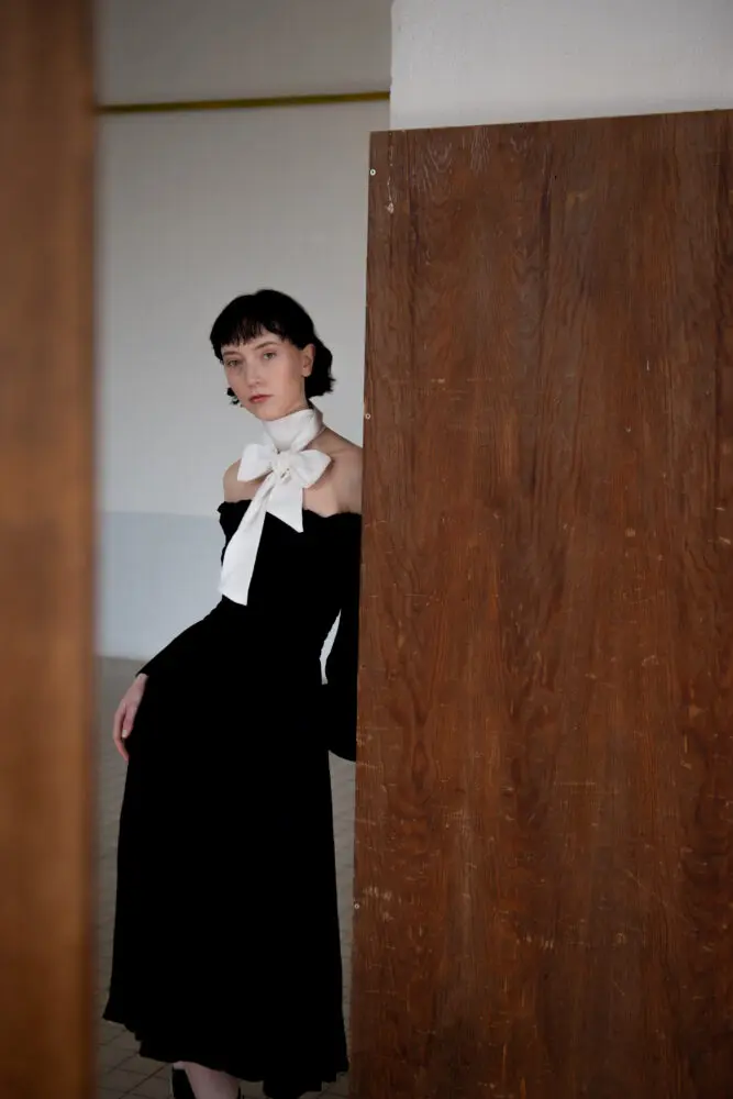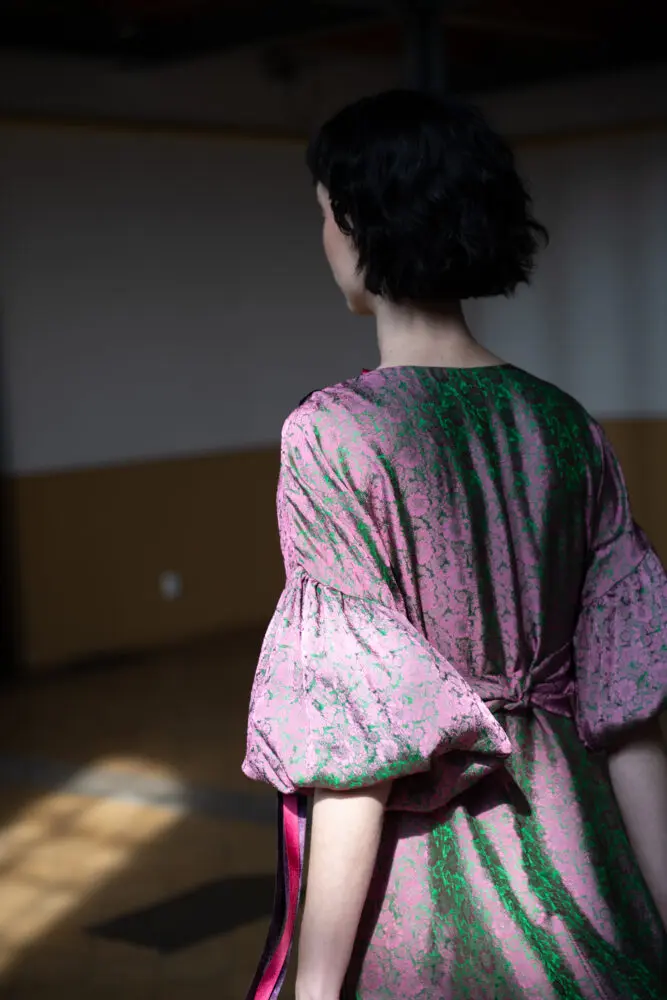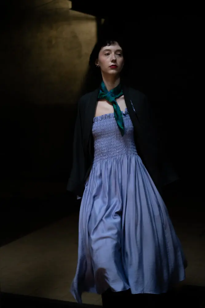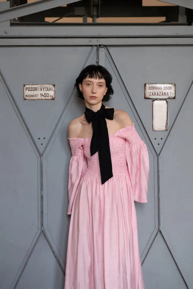 Antonie má na sobě šaty smoking, kimono rukáv, šátek zero-waste.