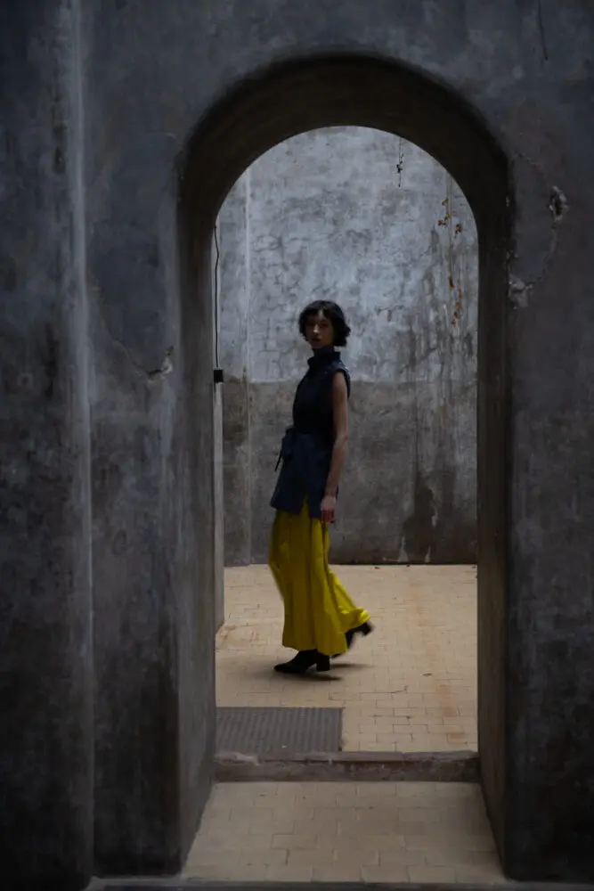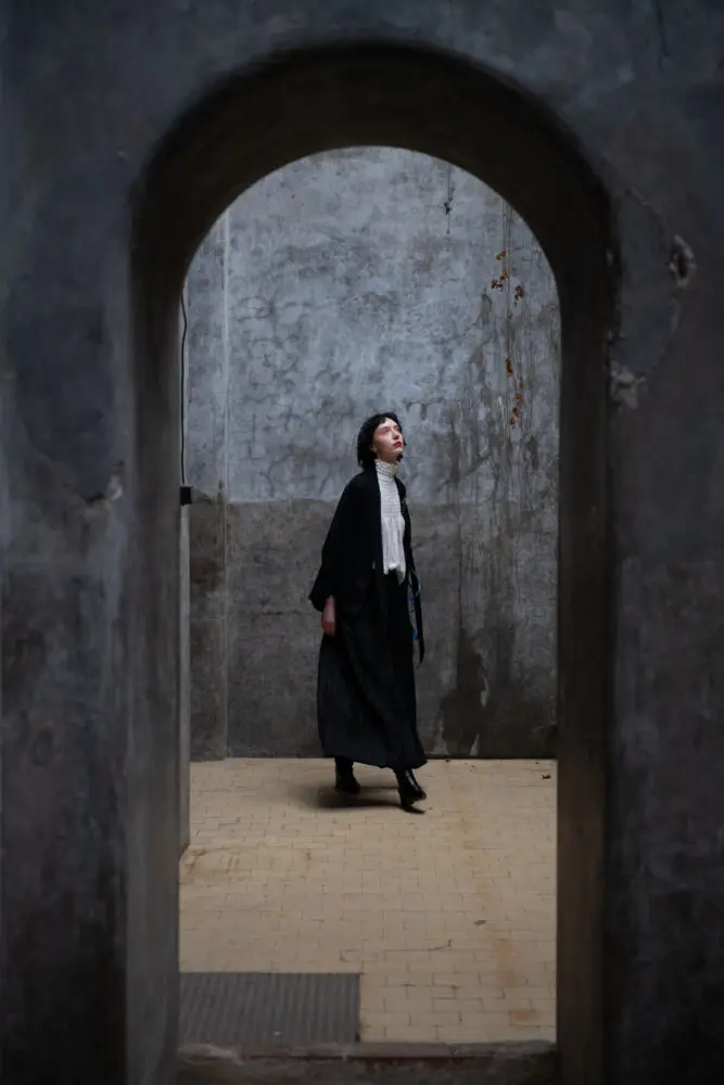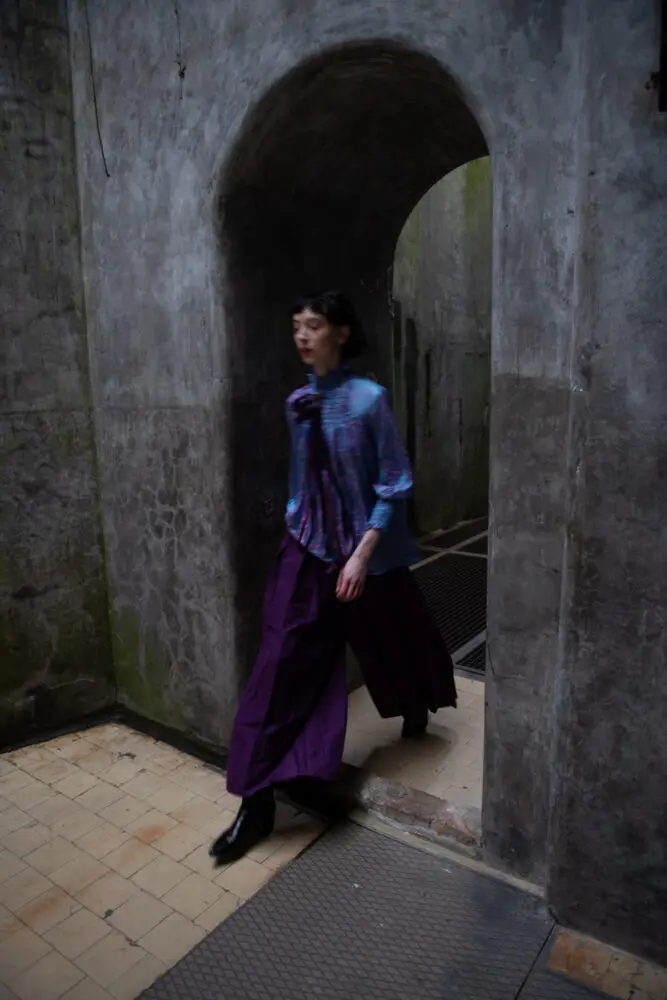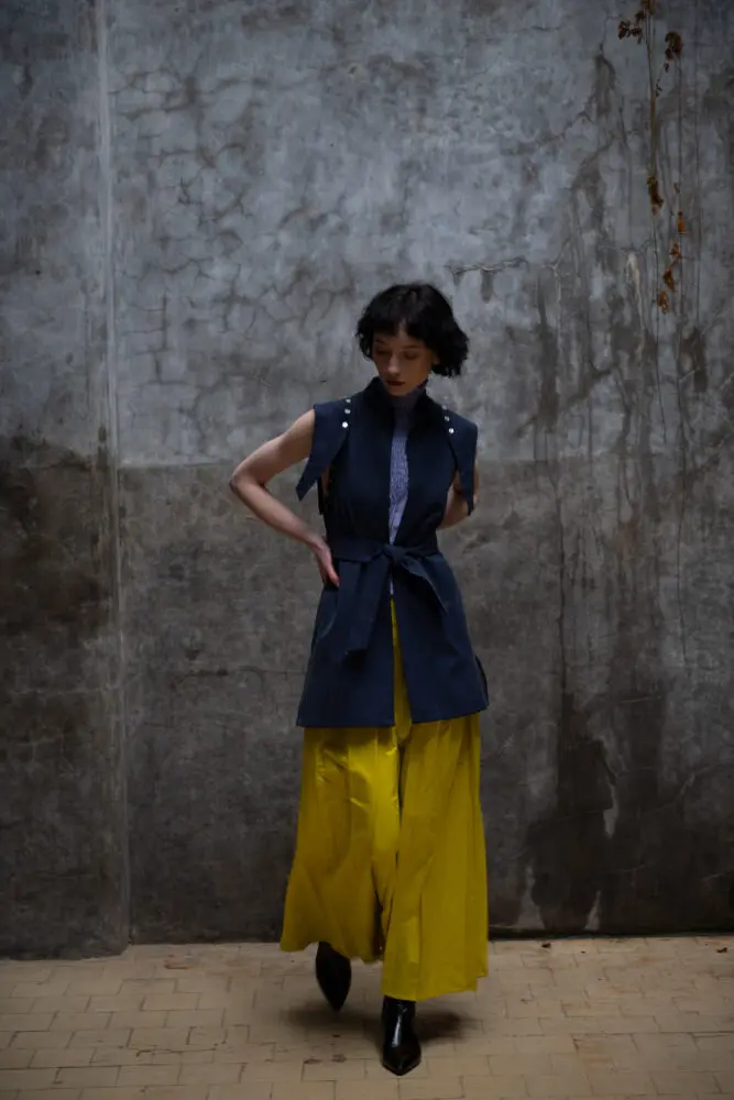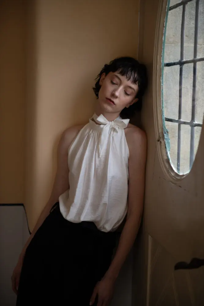 Antonie má na sobě šaty smoking, kimono rukáv, šátek zero-waste.