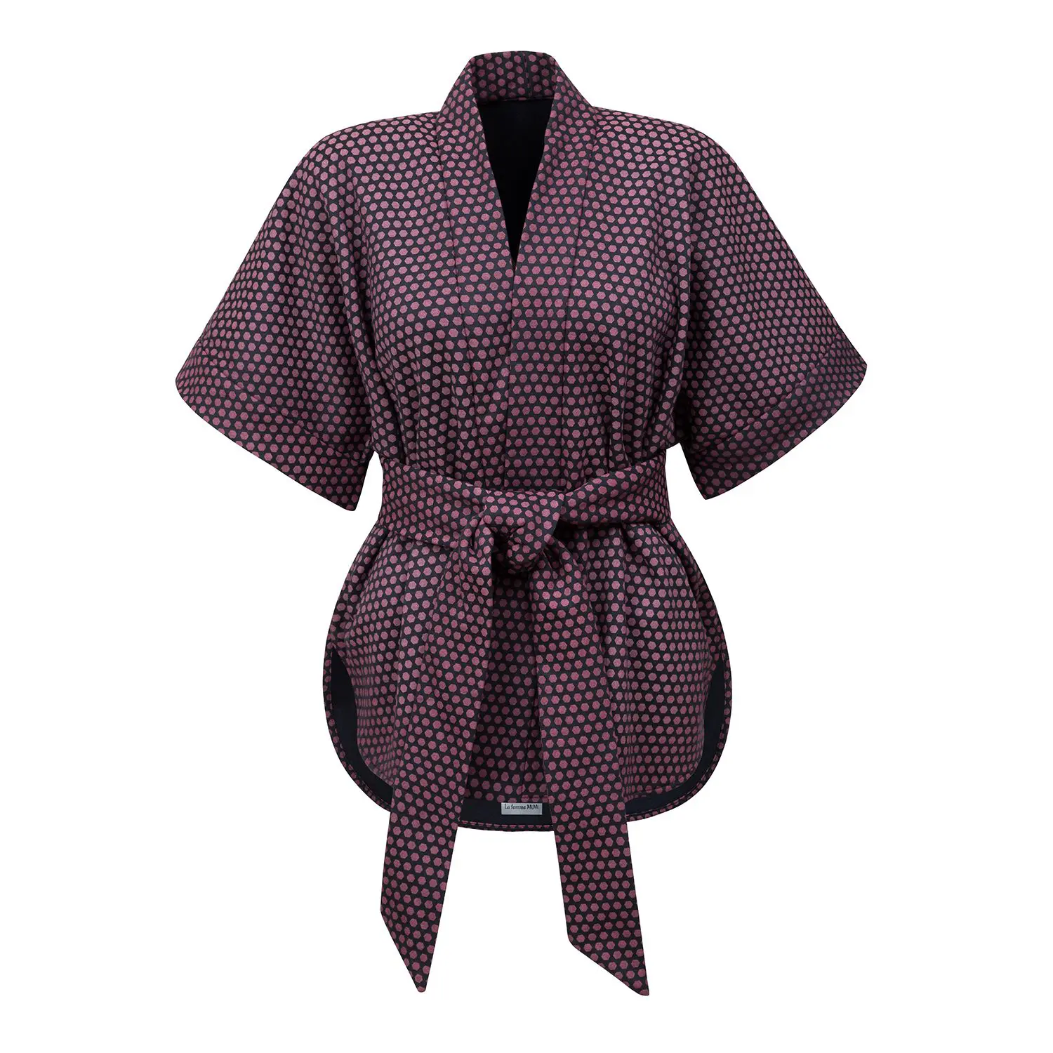 Kimono polka dots black and purple I believe that you can never go wrong with polka dots, which is why this piece is enriched with them. On a simple and elegant black base we have burgundy coloured circles. The pattern is as pleasing as the blackberries in the shady woods, the grapes of wine that have a rich and sweet taste, or the summer rain that also makes circles on the water. The kimono is reversible, so you can change sides, one day to have decorated bushes and the next to be shrouded in the mystery of the night. Another cool feature is its combinability, as it goes with absolutely everything. Wear it with a t-shirt, trousers, skirt, shirt or dress and you’ll always find the kimono adding a nice touch of Japanese style to your look. The tying is also up to you, whether you knot, bow at the front, back or side or simply wear it loose open, you can change it up every day and never get tired of it. Size one, universal.