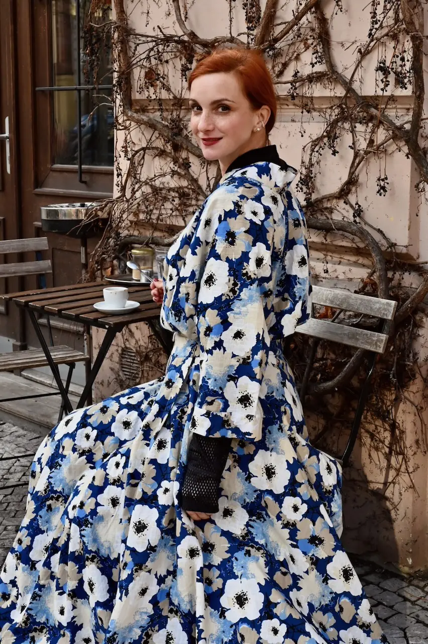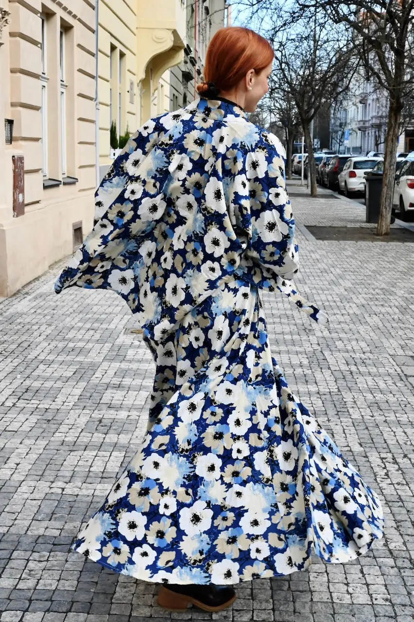The pattern of the fabric is reminiscent of delicate flowers floating on the deep blue surface of a lake. Blooming white poppies slowly dip and play with the waves. A fresh combination of colours that will take you wherever you want to go.