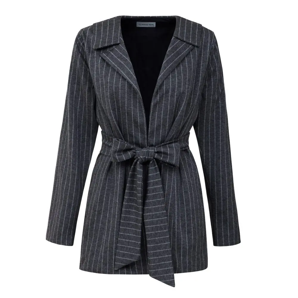 Looking for a simple blazer for the colder weather? If so, a blazer with an elegant collar on the front is just for you. The wider sleeves allow you to combine it with a thicker sweater, keep your arms warm in winter or you can elegantly roll it up to your elbows. It is up to you whether you leave the jacket loose or tighten it slightly at the waist. The white stripes on the grey fabric have never spoiled anything and can therefore be combined with everything.