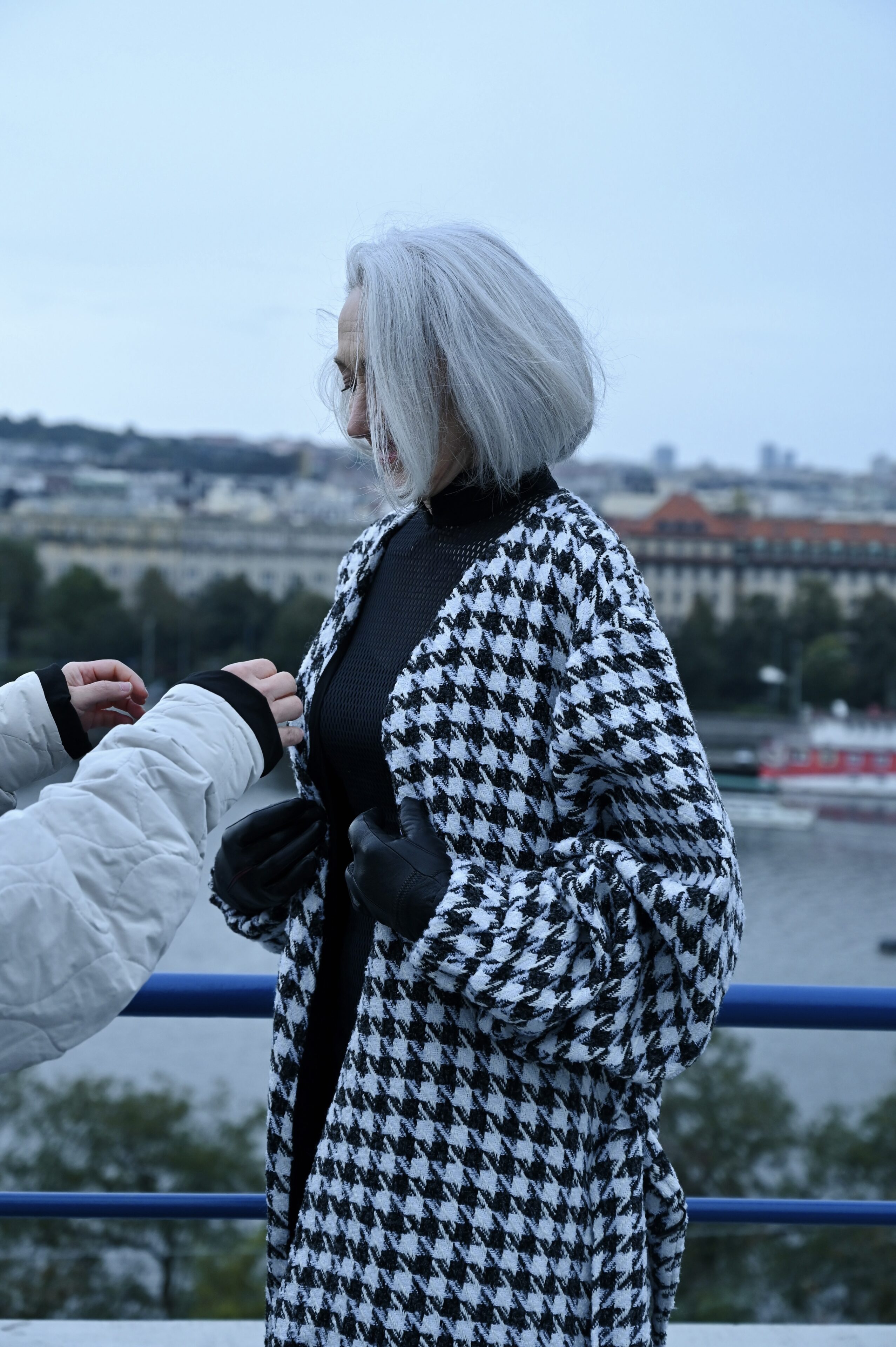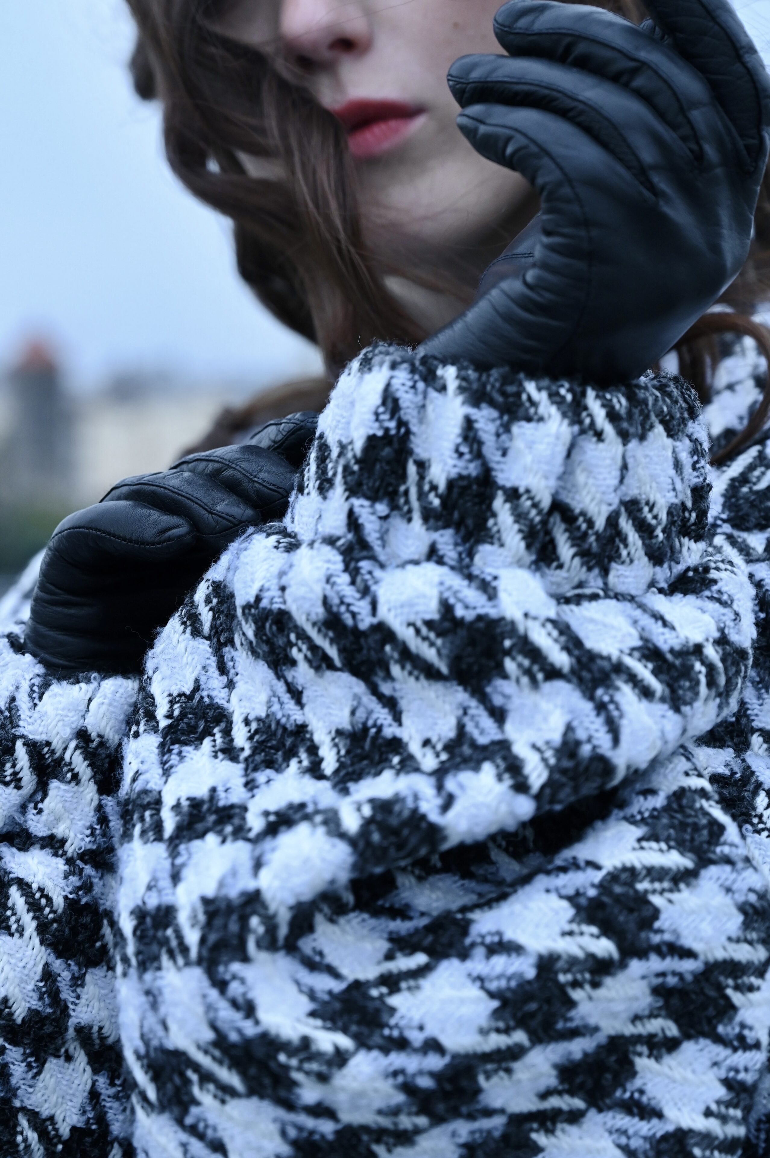 And we have just the one for you. The signature cut is similar to our puffer jacket — the one you might remember in cream or black. This coat comes in a black-and-white patterned tweed reminiscent of houndstooth. The pattern is intentionally diagonal, evoking falling rain, a chessboard, or even Star Wars.