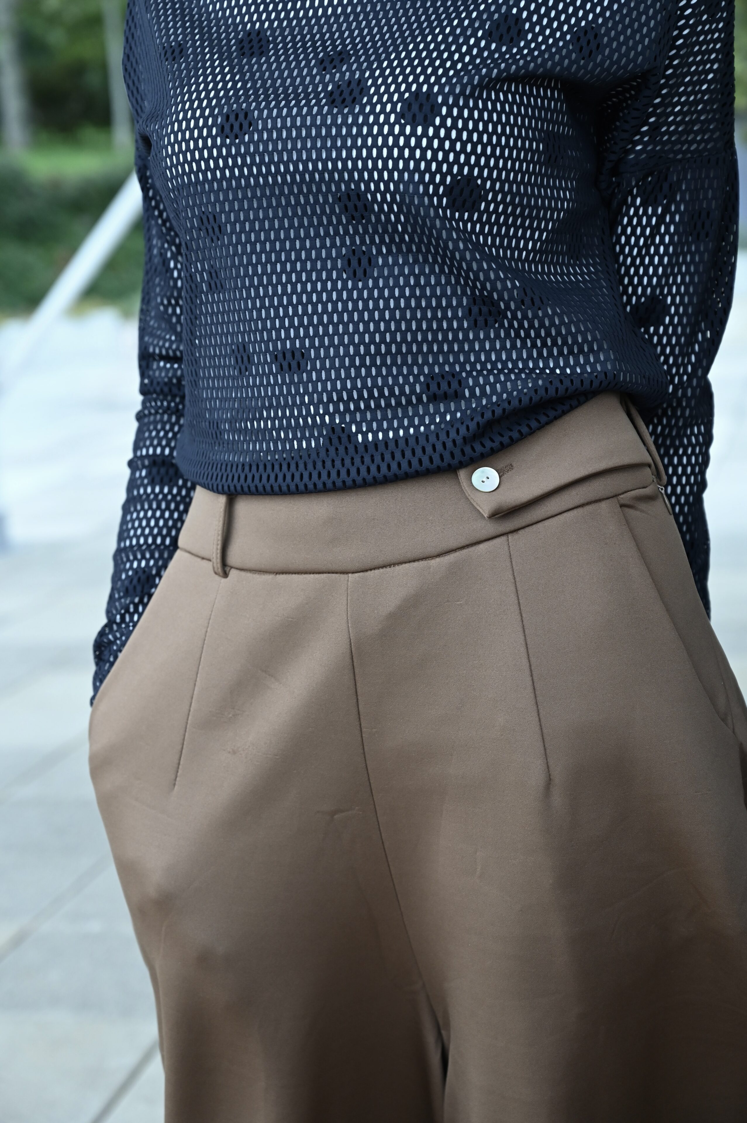 Semiš je otočený, aby jeho nejpříjemnější strana byla právě vevnitř a hýčkala vás. Signature střih se zapínáním na perleťový knoflík, inspirovaný tradičními vietnamskými kalhotami. Měli být praktické pro každodenní práce, společenské na večeři a příjemné. I naše kalhoty tyto body splňují, přijďte si je vyzkoušet na vlastní kůži.