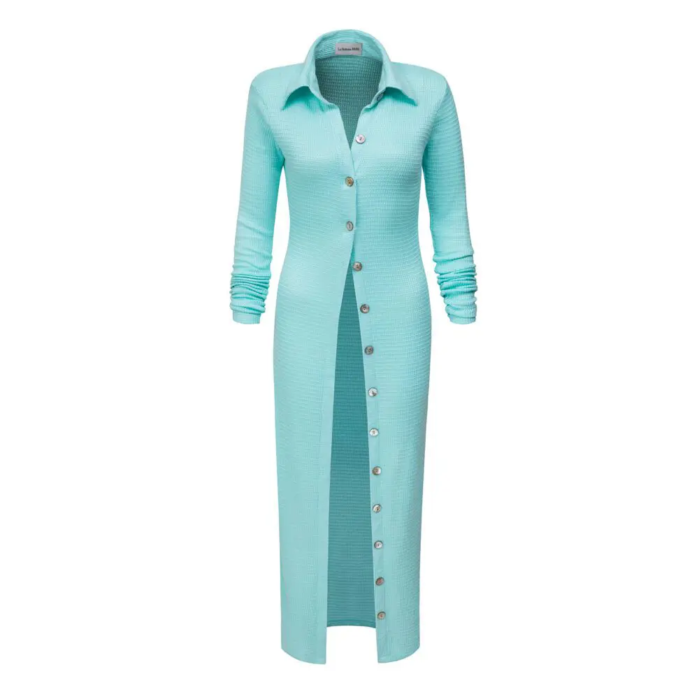 Přáli byste si nosit něco mezi košilí a kabátem? Příjemnou látku, která Vám bude sahat až pod kolena? Tato dlouhá košile z hebkého úpletu je právě pro Vás. Díky materiálu, z kterého je vytvořena, Vám obepne tělo, jemně obtáhne Vaše linie a slušivým způsobem je zdůrazní. Díky zajímavému střihu by měl být tento kousek nošen otevřený. Je hezké si zapnout pouze první dva knoflíky a zbytek košile nechat otevřený. Konce látky se přitáhnou ke kraji k Vašim bokům a vynikne tak pod ním jakákoliv sukně, šaty či kalhoty. V chladnějších dnech si ho dopnete perleťovými knoflíky, které jsou jemným detailem, stejně jako košilový límec. Úplet je velice příjemný materiál a tento typ ještě víc. Je prodyšný, takže se nemusíte bát že by Vám v něm bylo vedro. Na těle je jako pohlazení, pohodlný stejně jako domácí oděv, jen více luxusní a stylový. Je to nejlepší typ loungewear který byste našli:) Barevně je také velice slušivý. Tyrkysová, světlá modrá je odvážnější a veselejší typ, připomínající mělké písečně pláže a právě díky ojedinělosti této barvy všude vyniknete a rozzáříte své okolí. Noste ho pořád, ať už je venku jakkoliv a ať už pod ním máte cokoliv, užijte si ho!