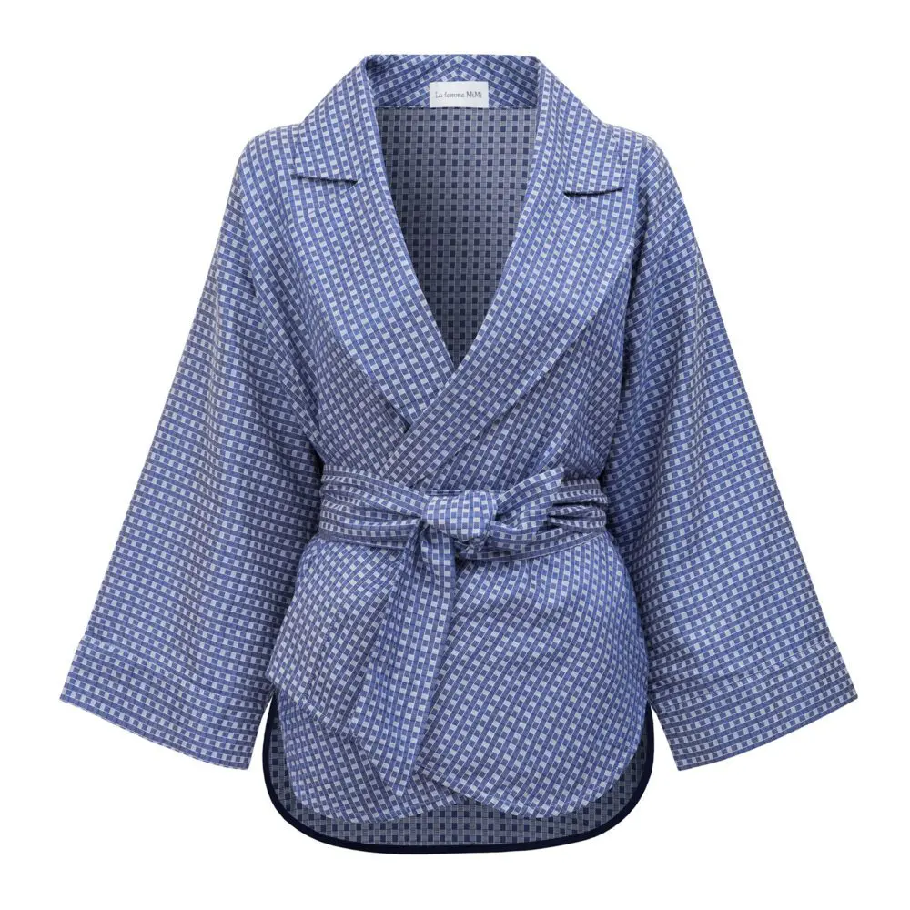 Kdybychom vzali nebe s mraky a vměstnaly je do kostiček, vypadaly by jako tento vzor. Modrá střídá bílou, vzájemně se doplňují a opakují. Lehkost a odvázanost doplňují sny a chlad. Kimono s takto chytlavým vzorem musíte mít!