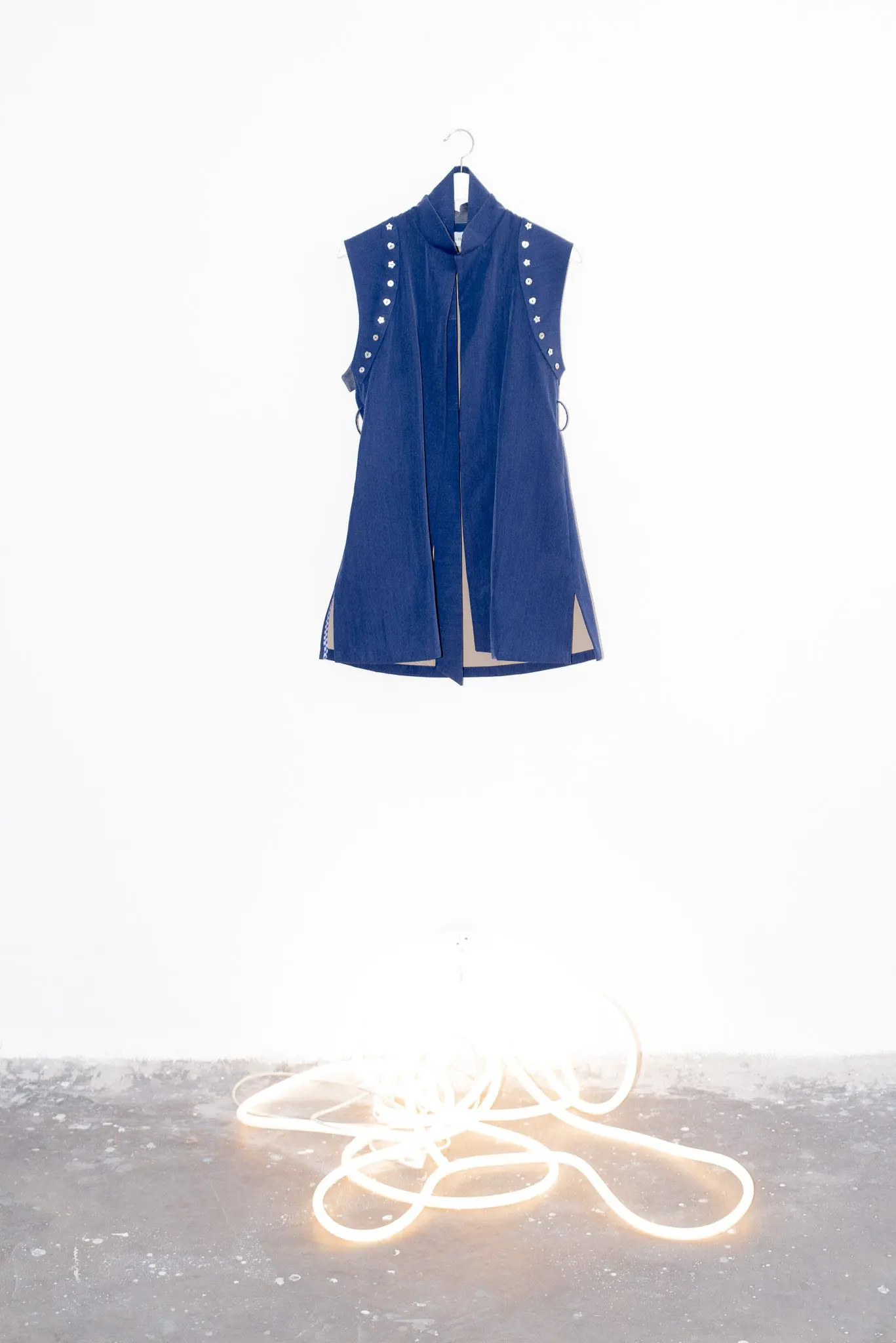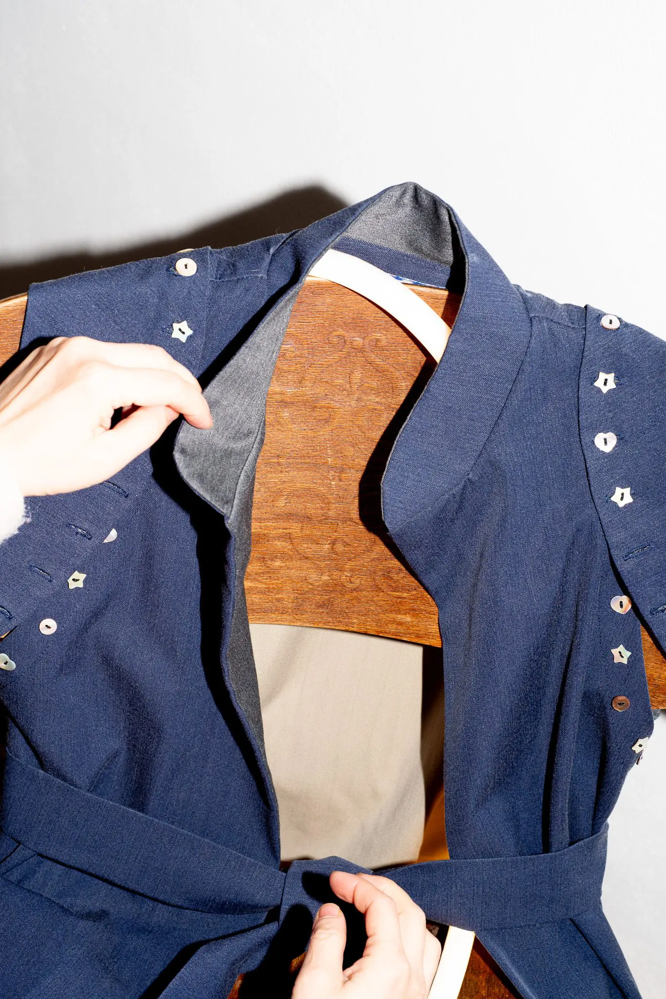 Dominantním prvkem jsou odnímatelné nárameníky vytvořené ze zbytků látek, které dodávají modelu hravost i proměnlivý charakter. Ramena zdobí ručně přišité perleťové knoflíky, evokující uniformu pilota či generála zeměkoule – jako by šlo o oděv pro imaginární výpravu za hranice všednosti.