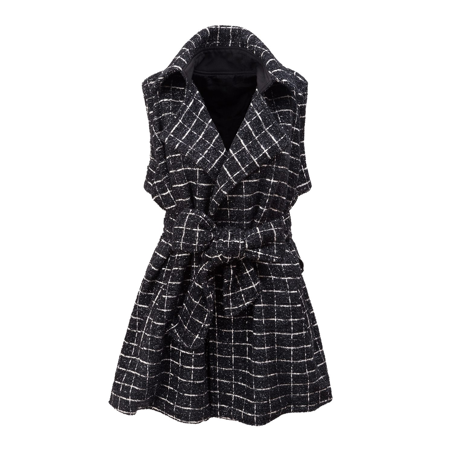Délka a límec zůstává v kabátovém stylu, spolu s šikmými kapsami a páskem v pasu ze stejné látky.