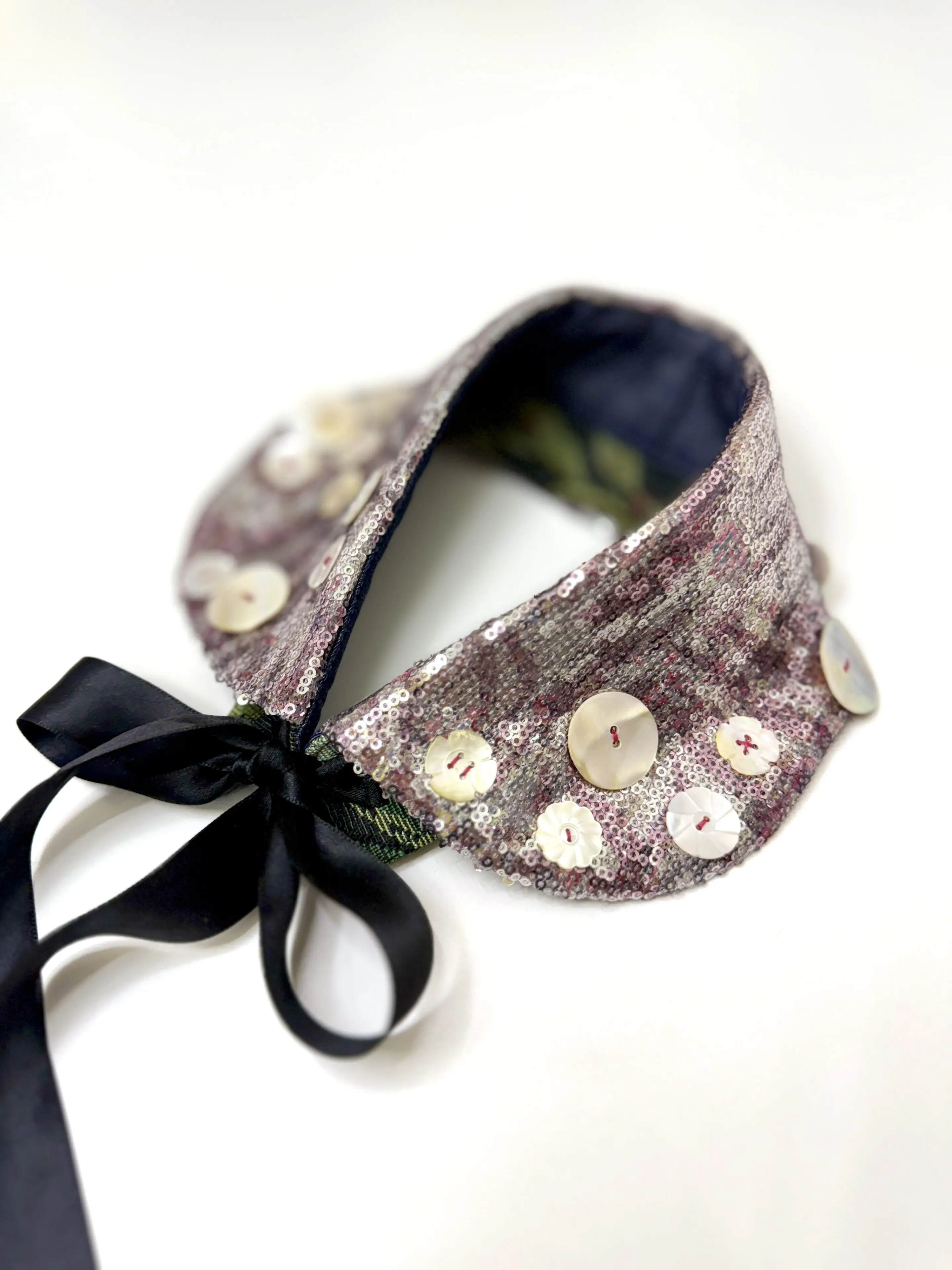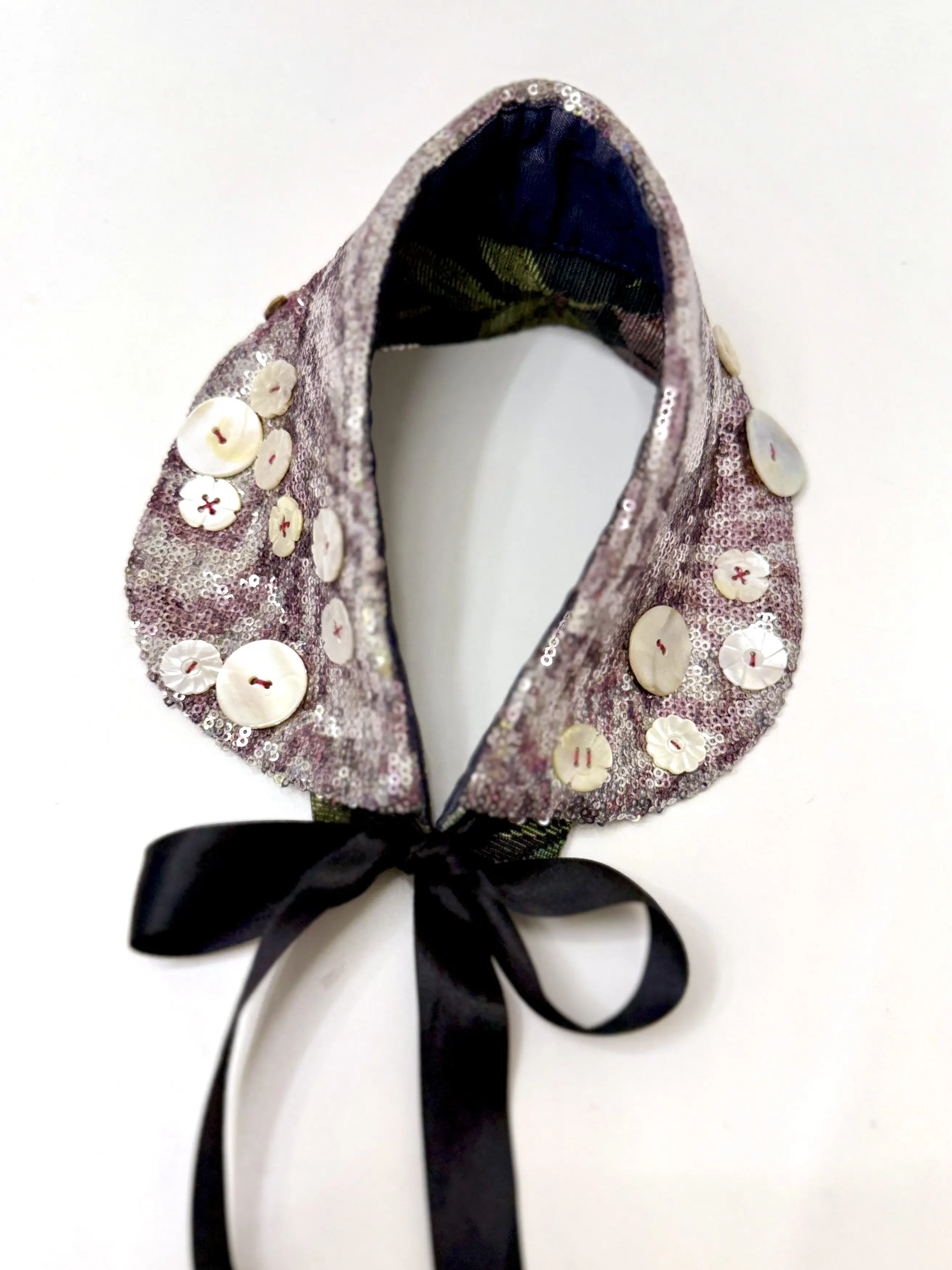 Zapomeňte na diamanty. Tento večerní límec je zero-waste zázrak, ručně vyšívaný starými perleťovými knoflíky z minulého století. Každý steh nese historii a eleganci, kterou žádný běžný šperk nenabídne.